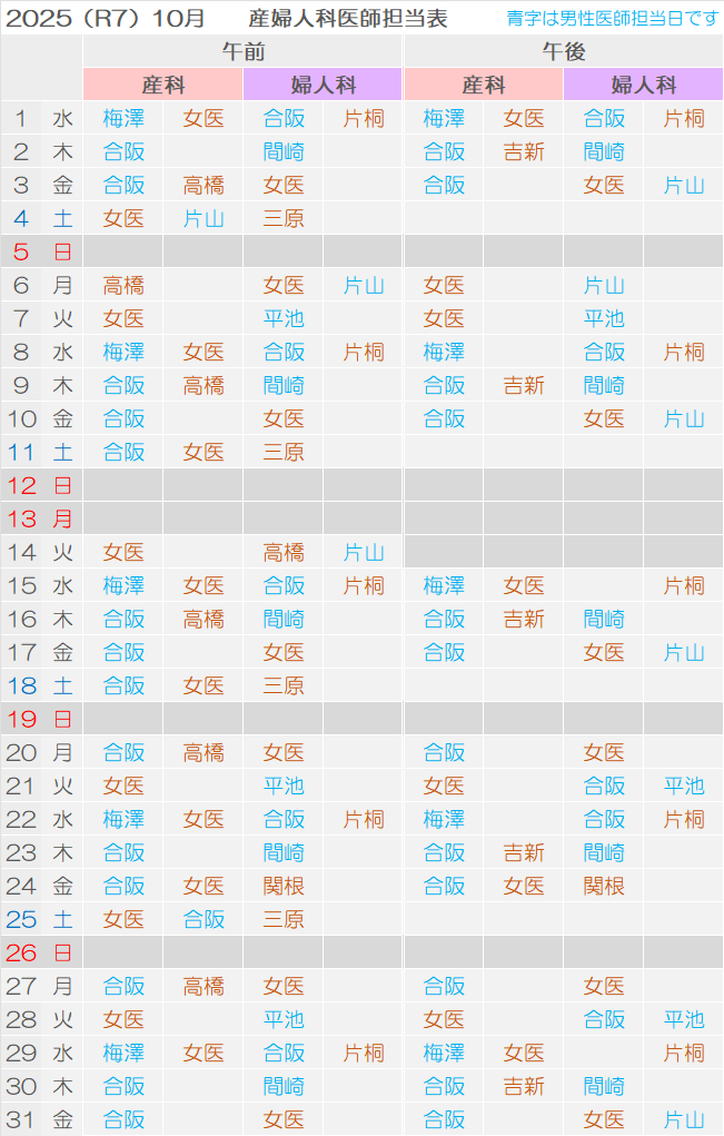 産婦人科外来医師担当表
