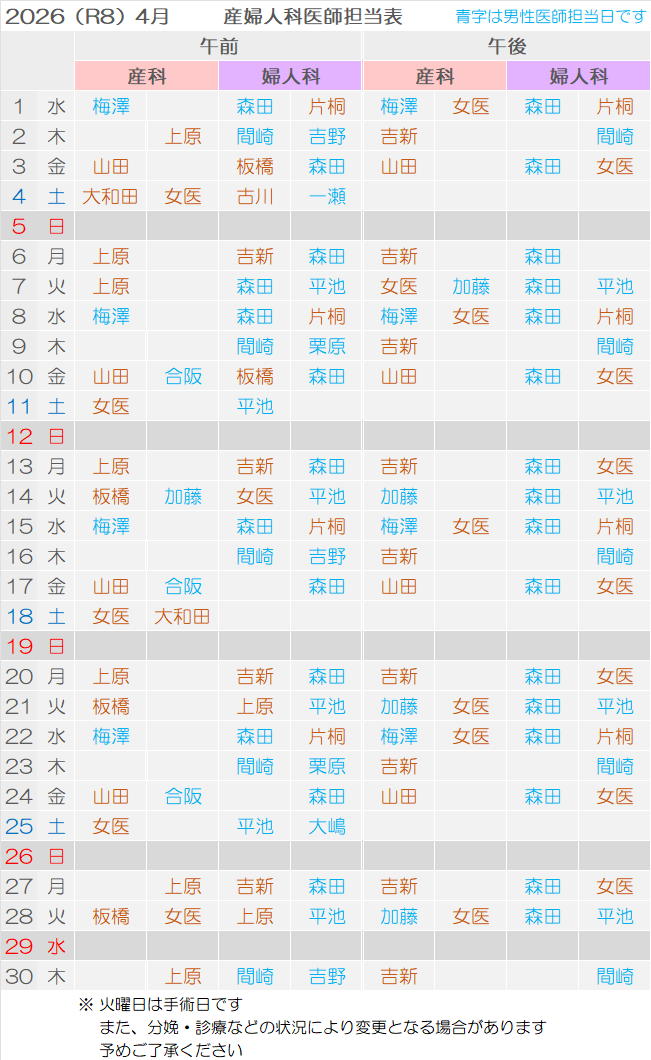2026年4月産婦人科医師担当表