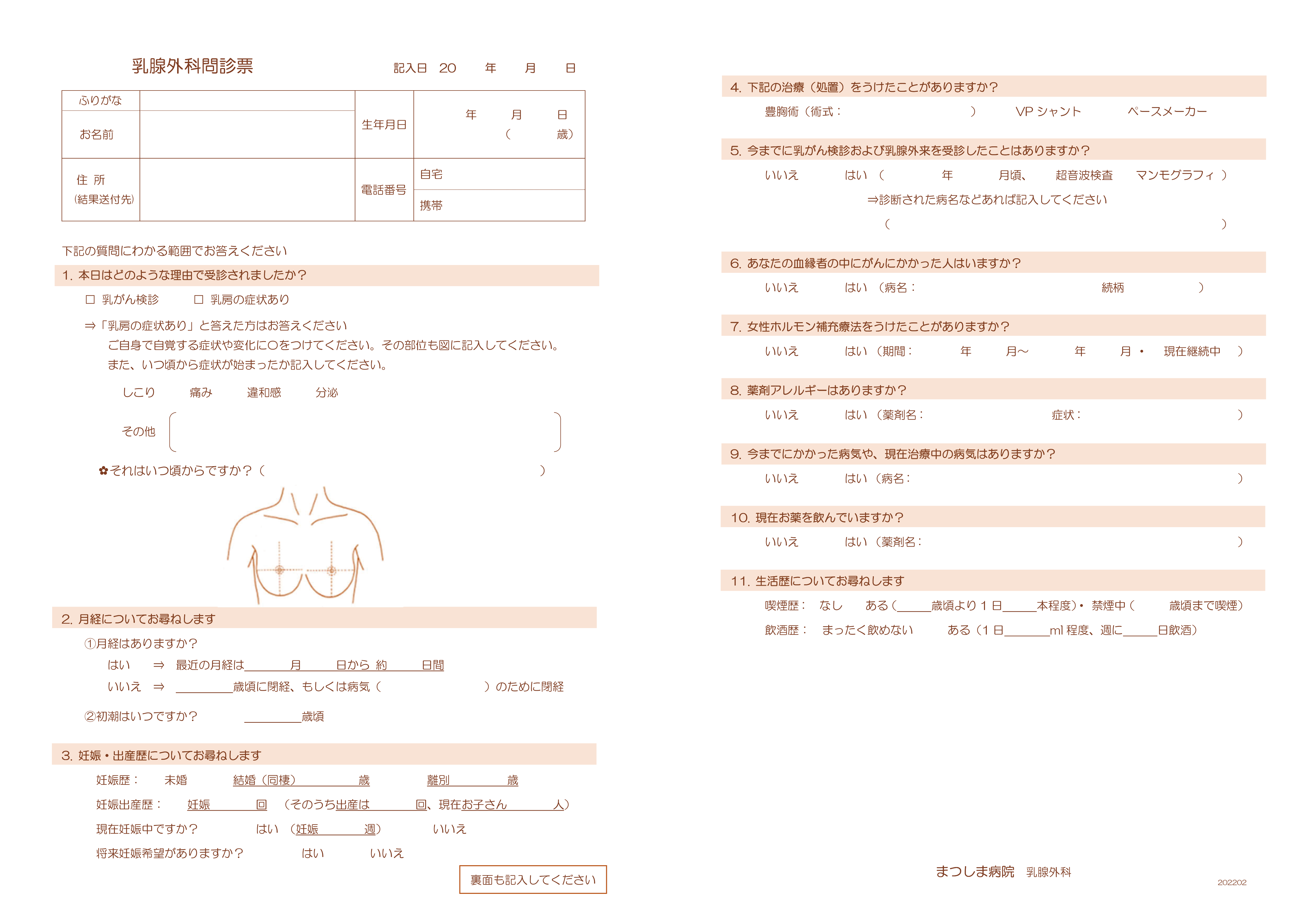 - 一般診療:乳房に何らかの自覚症状がある方(しこり、痛み、分泌物など)